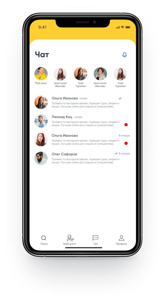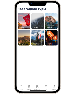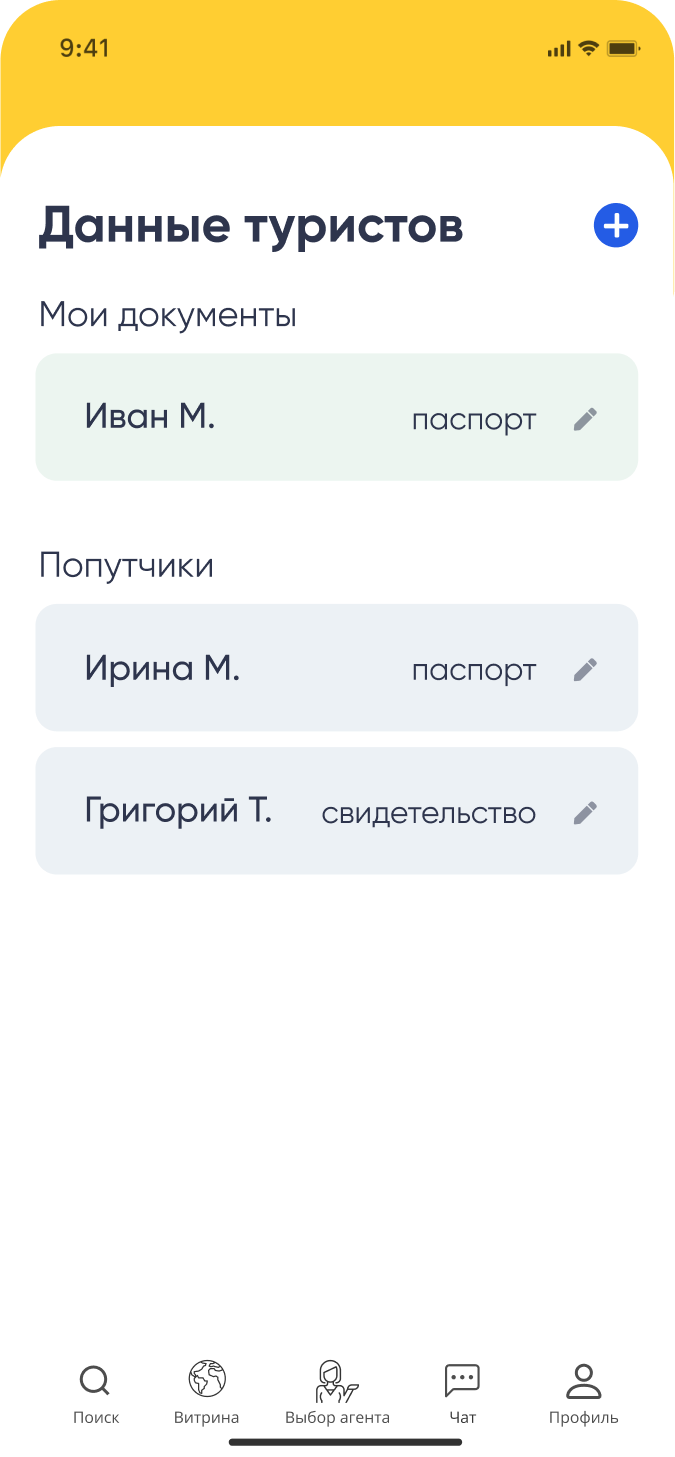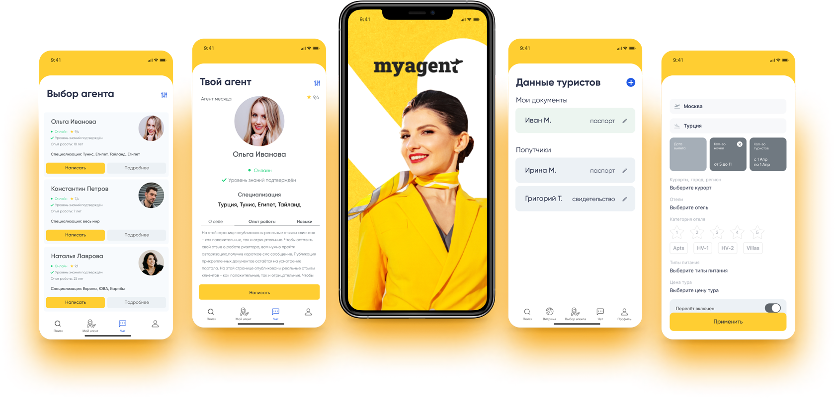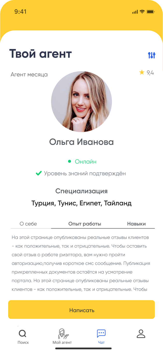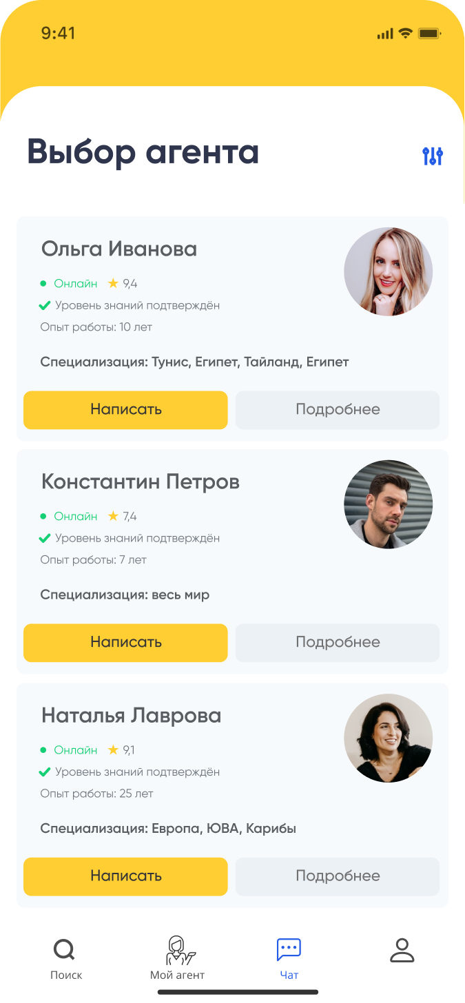 В приложении предусмотрена визуальная возможность выбора туристического агента, проверенного сервисом, по его профилю